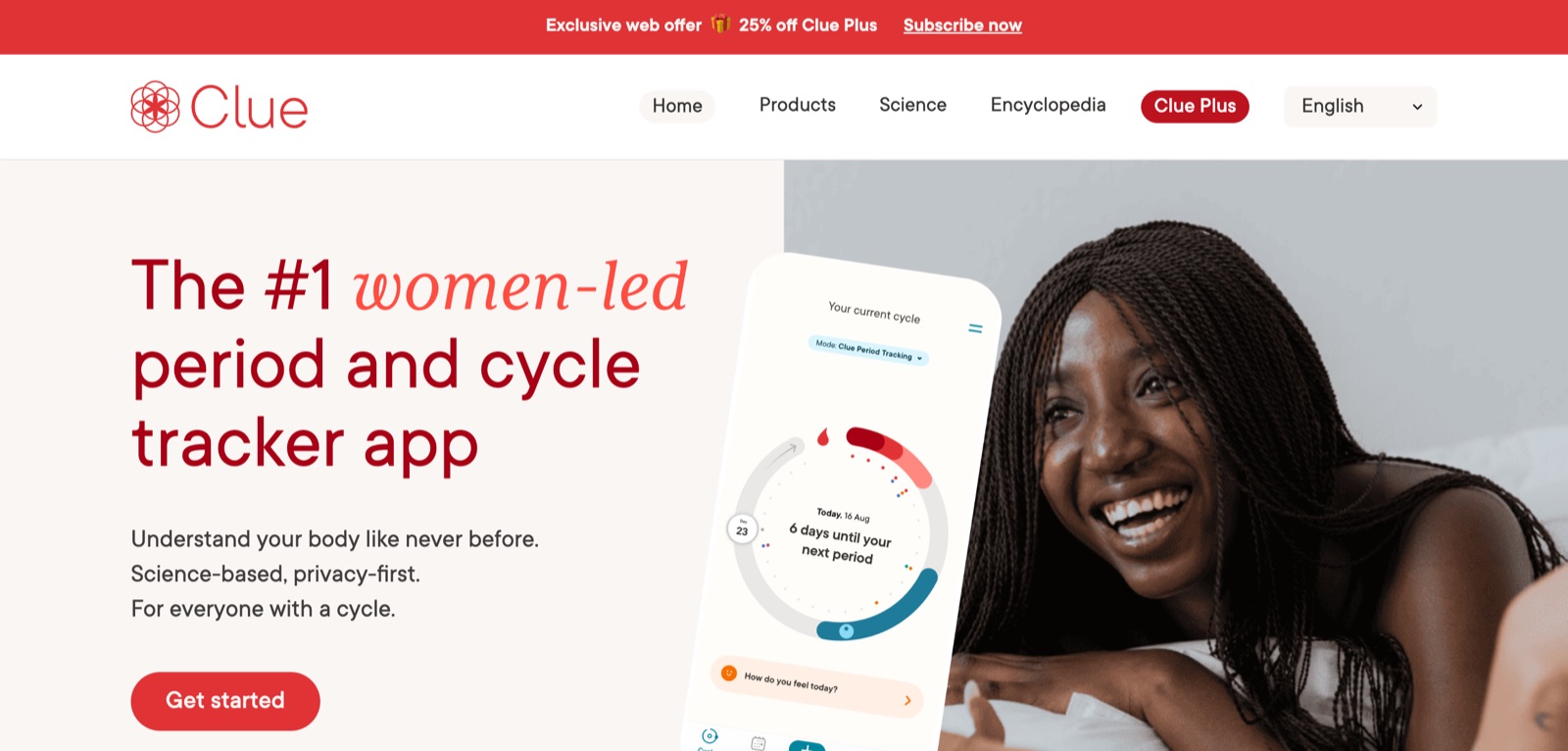 Clue homepage. Source: helloclue.com, captured 2026-04-29.