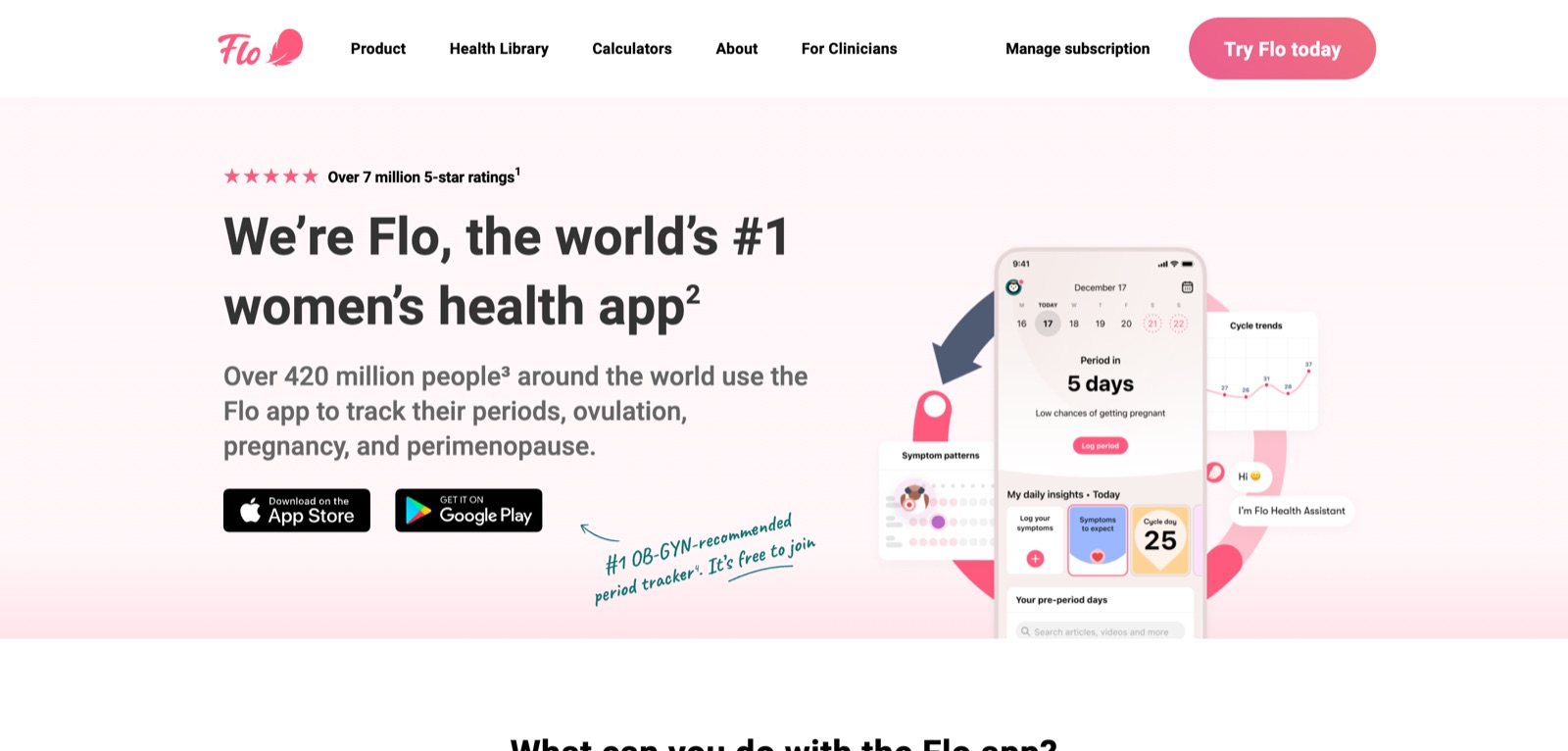 Flo is the largest period tracker globally with 380+ million users. Strong at period prediction, symptom logging, and AI-driven cycle insights.