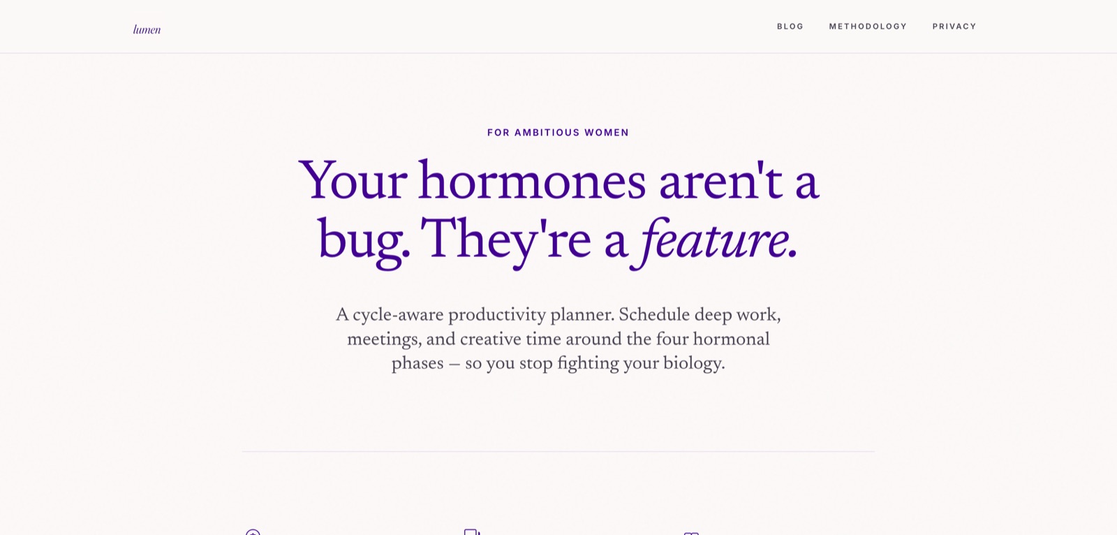 Lumen is a free cycle-aware productivity planner. It calculates the current phase from three inputs (last period start, cycle length, period length) and recommends which task types fit which phase: deep work in follicular, presentations in ovulatory, editing in luteal, reflection in menstrual.